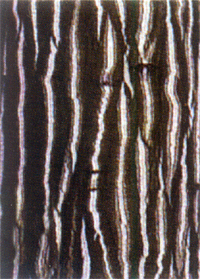 树皮光滑,绿色或灰绿色,带有非常漂亮的白色条纹,有时有粉白色条纹;叶棕绿色,叶脉锈红色,九月叶呈红色或橙色。